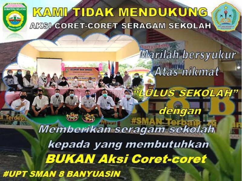 Aksi corat-coret seragam sekolah tidak mencerminkan siswa yang berkarakter. UPT SMAN 8 Banyuasin siap menampung dan menyalurkan seragam yang masih layak jika ingin disedekahkan.
